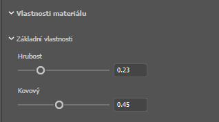 • V novo otvorenom okne zájdeme do sekcie materiály, kde nastavíme hrubosť na približne 0.23 a kovovosť na 0.45.